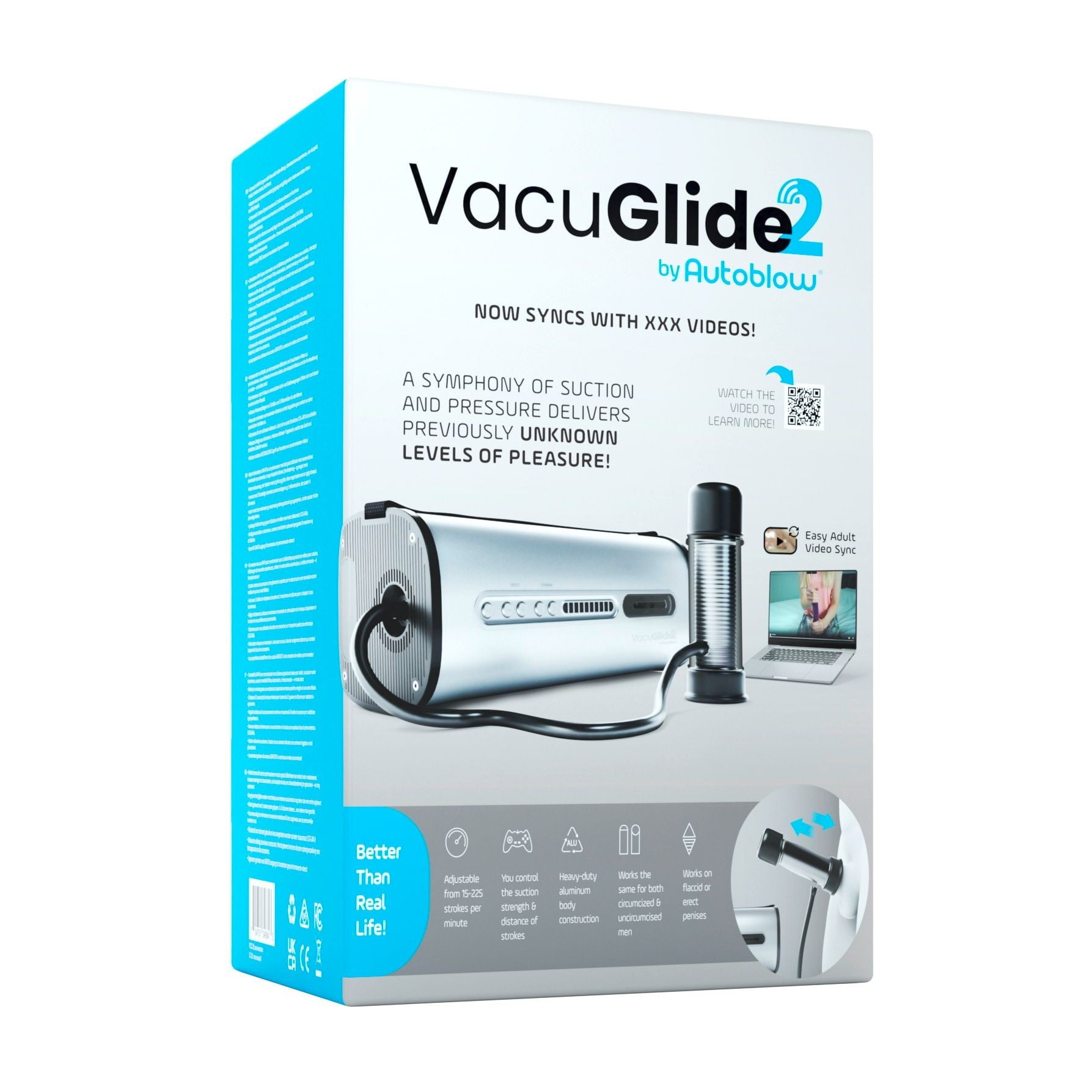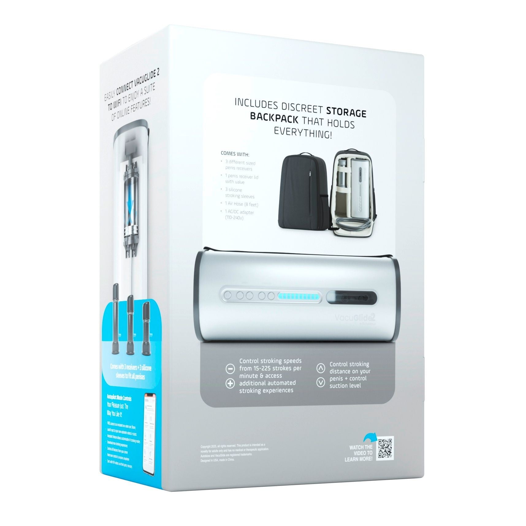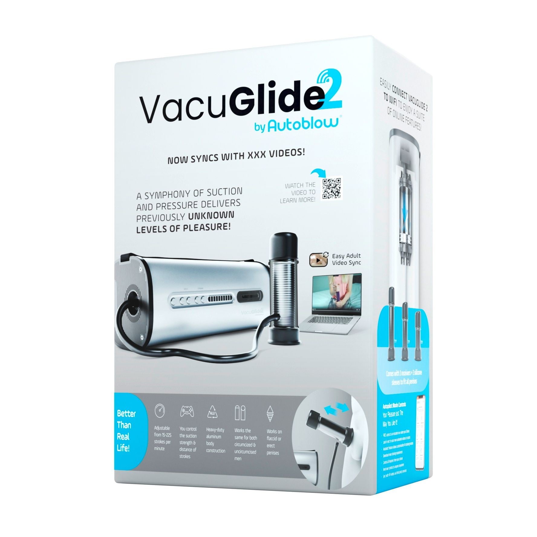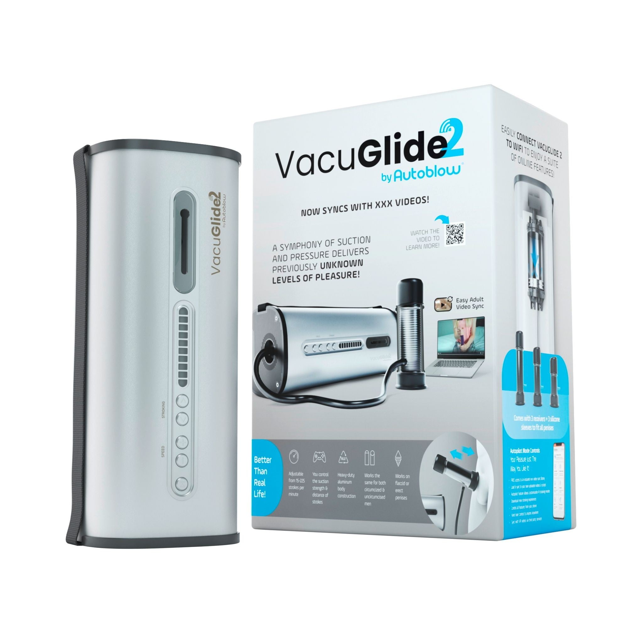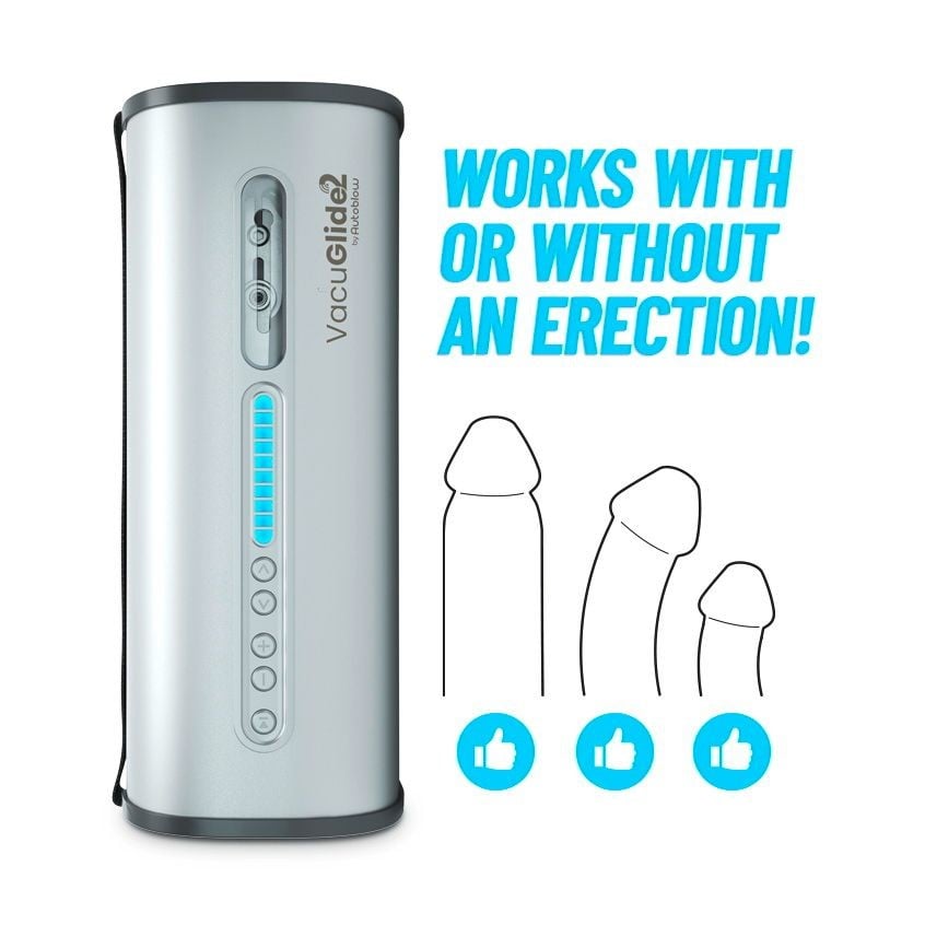 Stroj disponuje 20 rychlostmi, manuálně nastavitelnou délkou přírazu a 25–200 sacími impulsy za minutu. Dodávané 3 silikonové nástavce různých velikostí zajistí perfektní přilnutí pro každý penis. VacuGlide 2 funguje i na ochablé penisy díky vakuovému sání a je ideální pro trénink výdrže s možností okamžitého zastavení tlačítkem „pauza“.