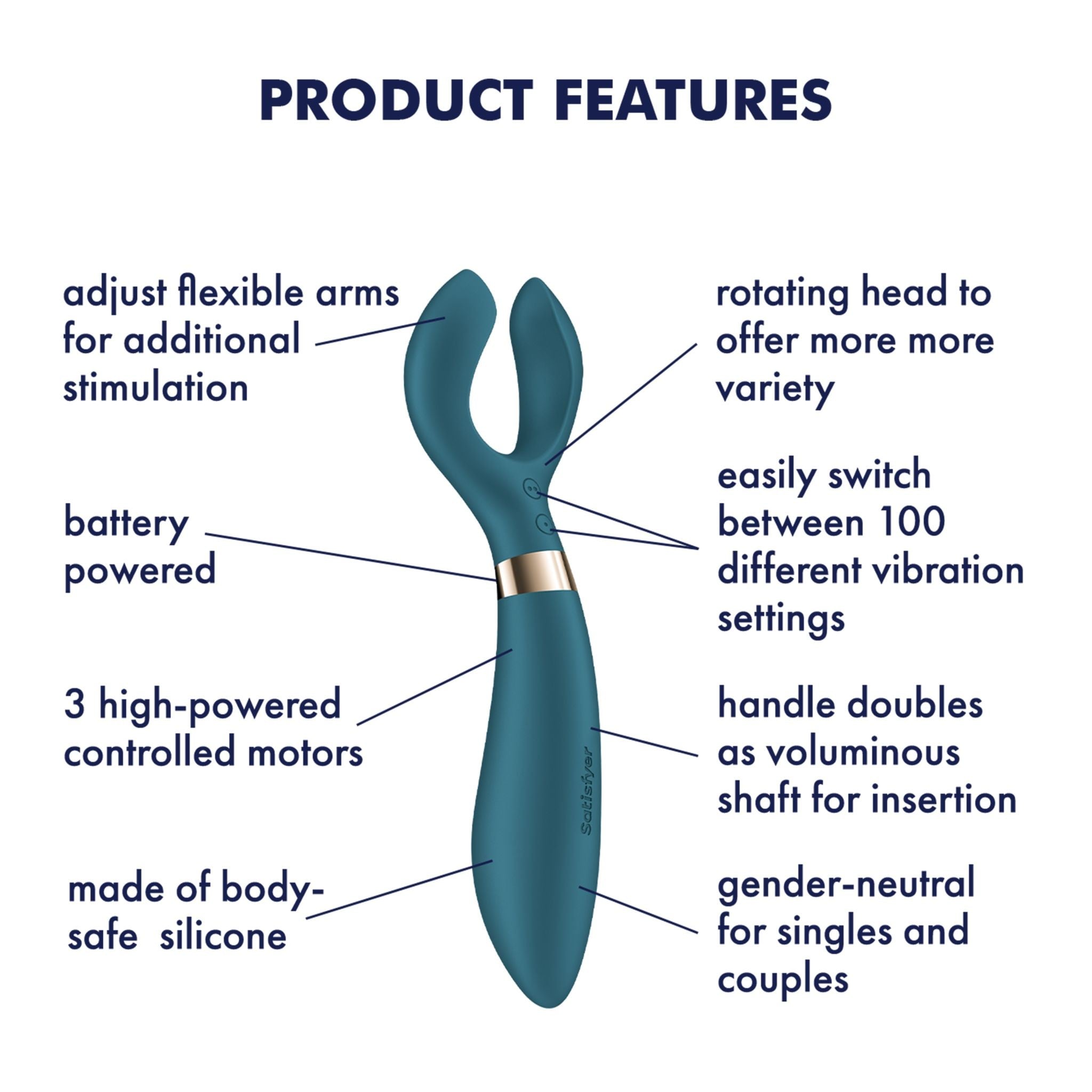 Stimulátor je vybavený 3 výkonnými motory, které se nachází v hlavní části i ve flexibilních ramenech. Každý konec nabízí 10 vibračních programů, které lze kombinovat až do 100 různých variant, takže si intenzitu i rytmus snadno přizpůsobíte své náladě.