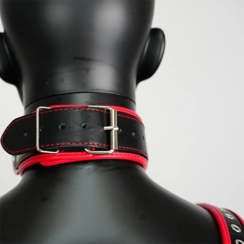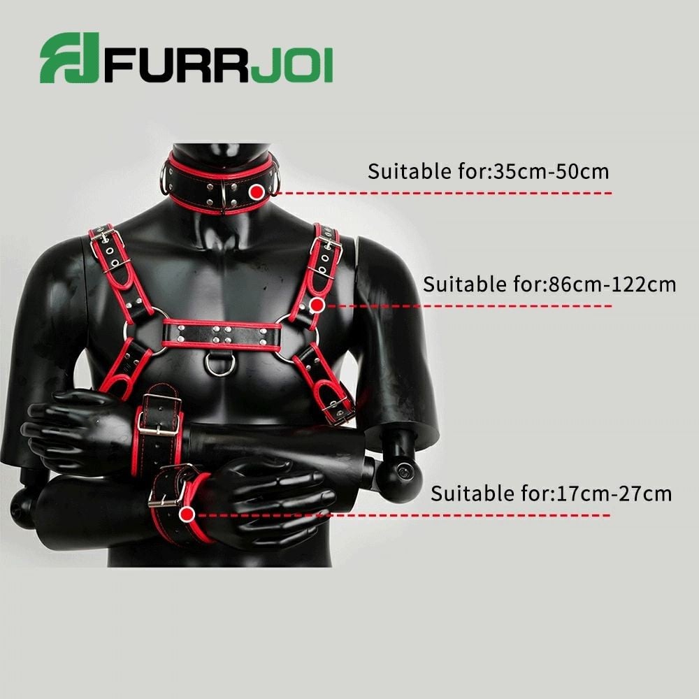 BDSM sada z umělé kůže v černo-červeném provedení. Obsahuje hrudní postroj, pouta na ruce a obojek s kovovým D-kroužkem. Všechny části jsou nastavitelné pro pohodlné a bezpečné nošení. Rozměry (cca): obojek 35-50 cm, hrudník 86-122 cm, pouta 17-27 cm. Více informací