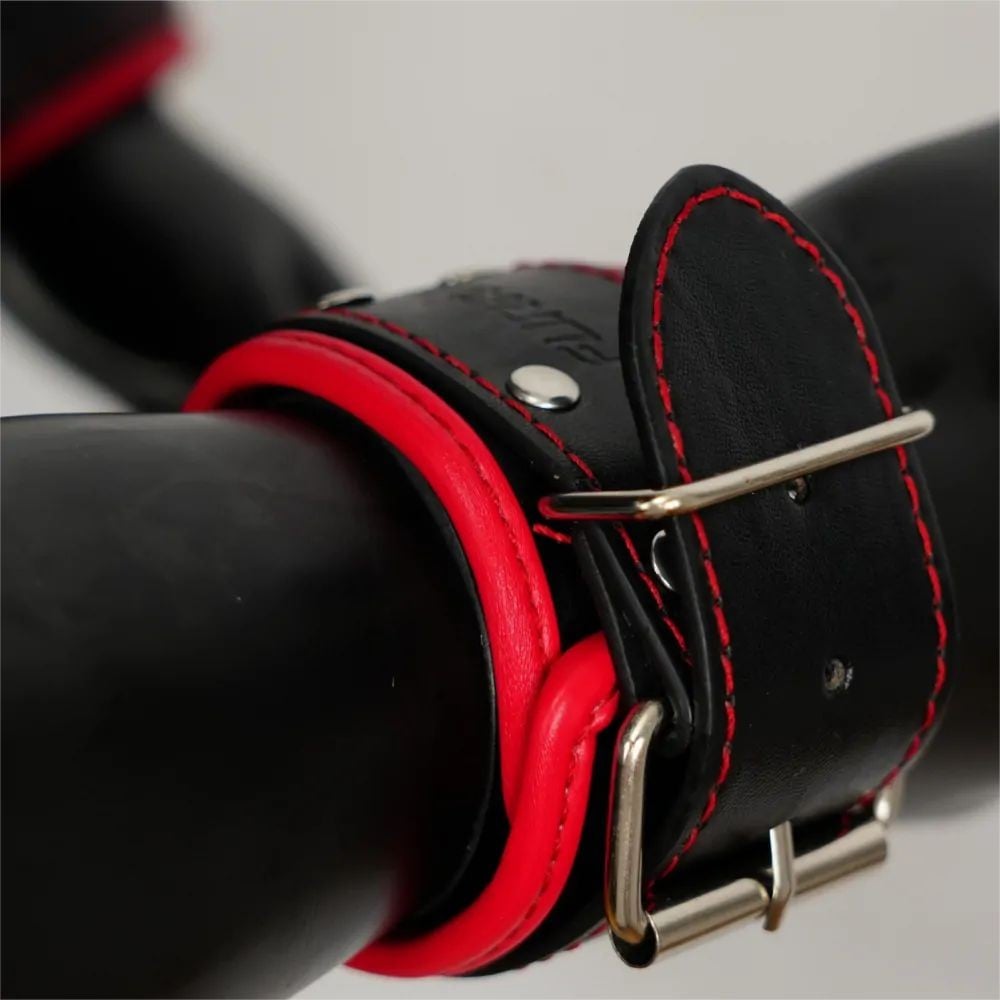 Obojek s kovovým kroužkem slouží jako výrazný symbol podřízenosti a zároveň praktický bod pro připnutí vodítka či dalšího příslušenství. Součástí sady jsou také pouta na ruce, která umožňují omezení pohybu a podporují dynamiku kontroly a odevzdání.