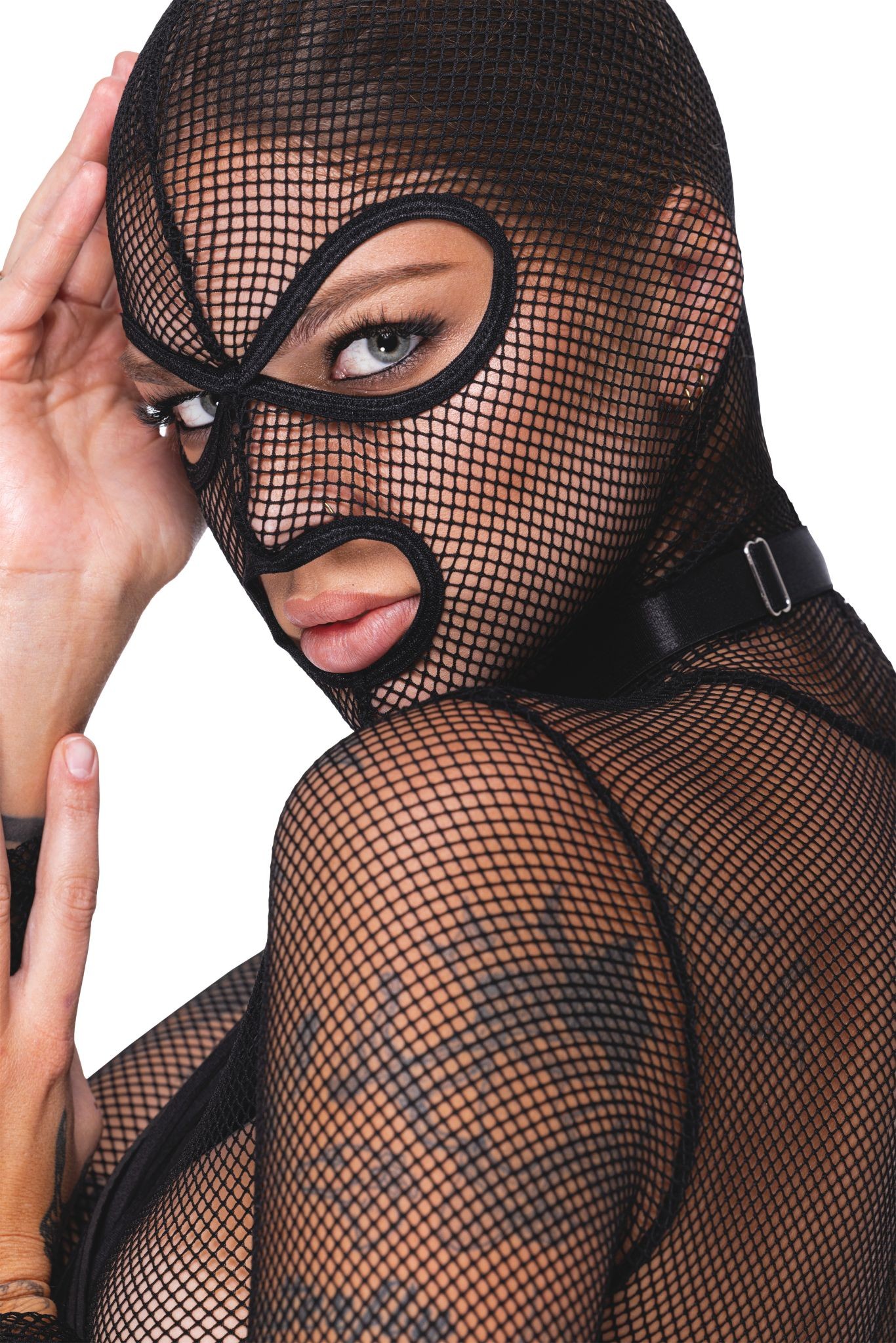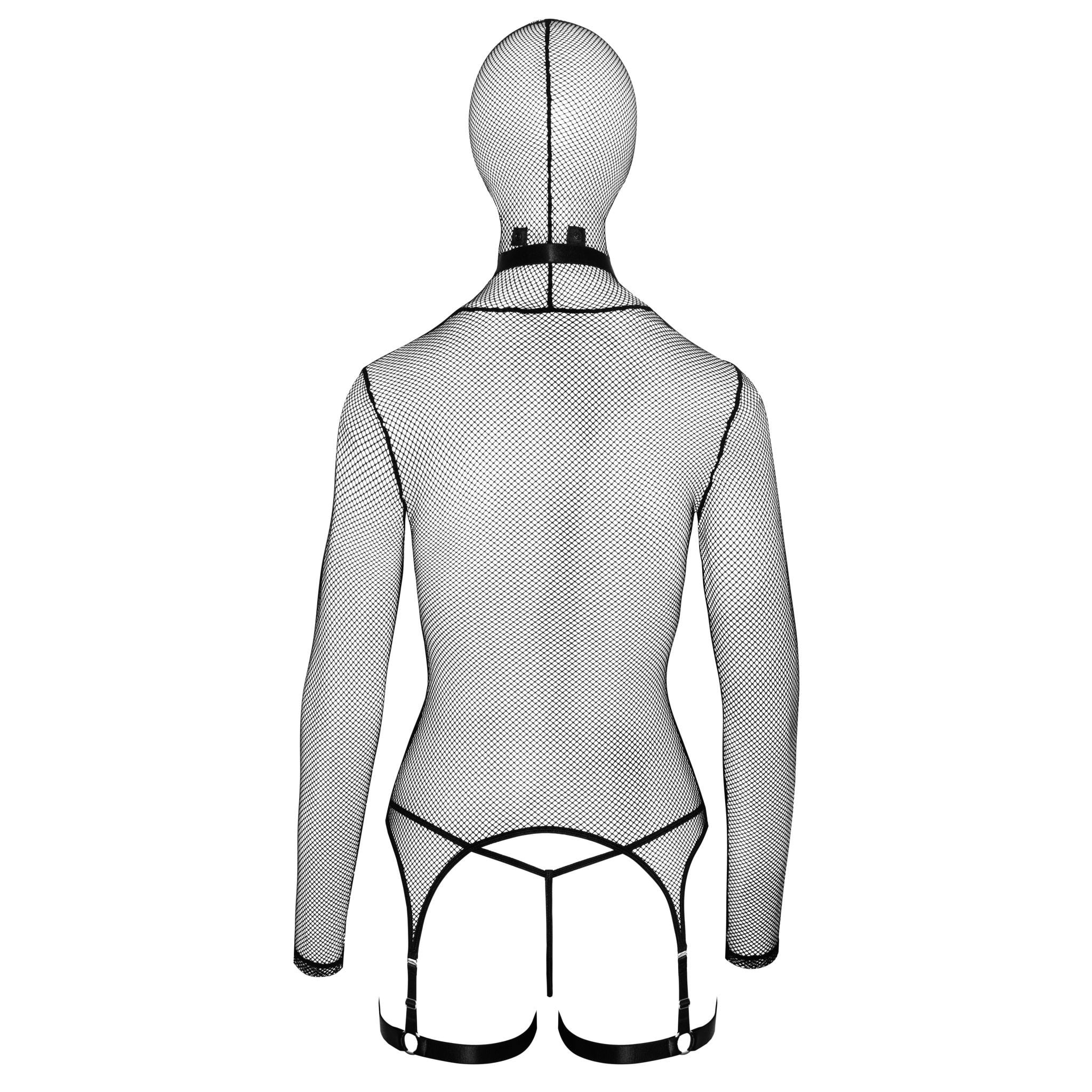 Kukla má otvory pro oči a ústa, čímž vytváří dramatický a dominantní vzhled. Elastická síťovina je měkká, příjemná na dotek a přiléhá k tělu tak, aby zvýraznila siluetu. Díky pružnosti materiálu je celý set velmi pohodlný na nošení.