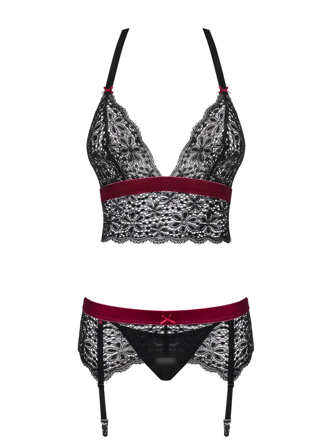 Souprava černého erotického prádla s květinovým motivem, rudými detaily a červenými mašličkami. Průsvitná podprsenka, podvazkový pás a tanga zdobená krajkou. 90 % polyamid, 10 % elastan. Více informací