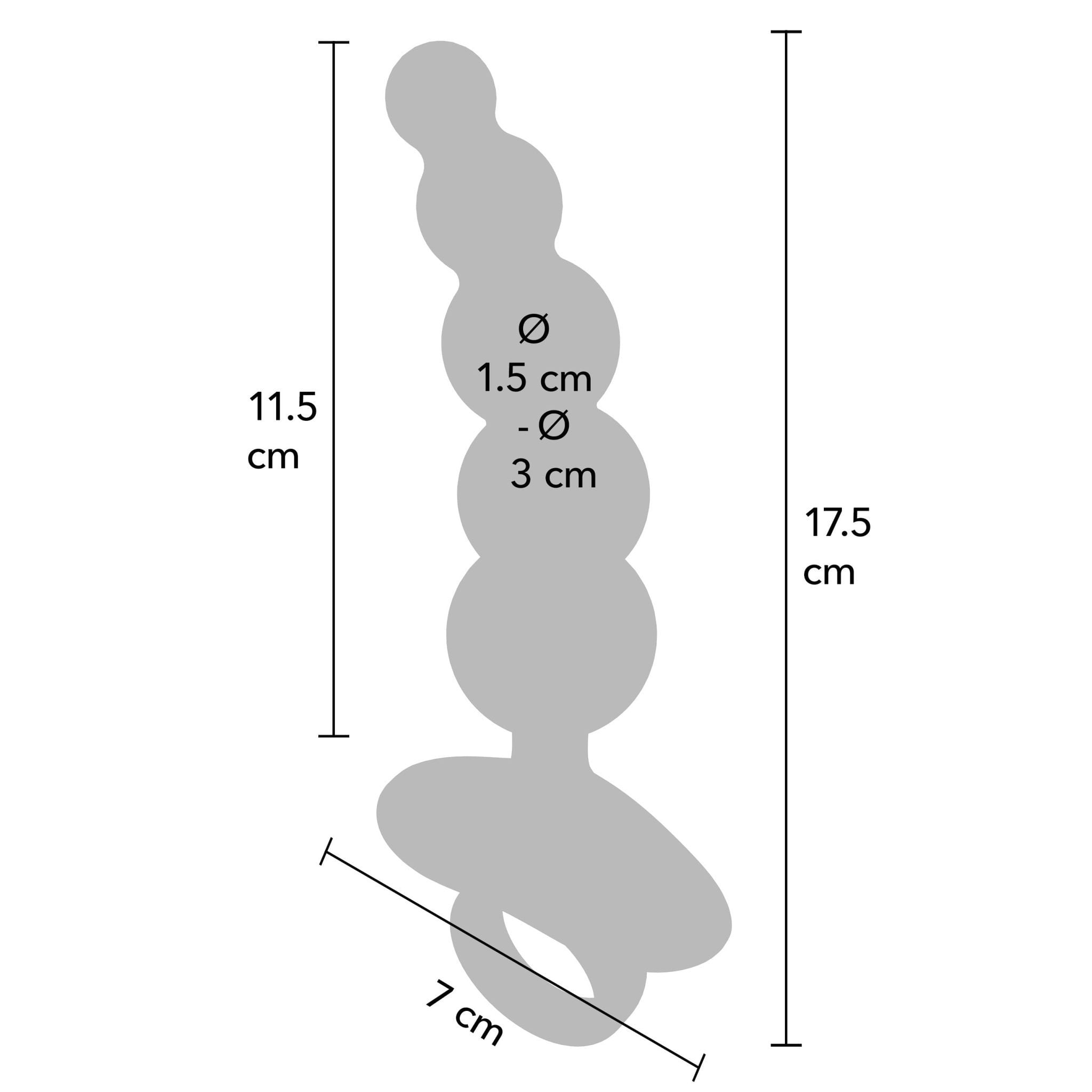 Anální kolík složený z 5 postupně se zvětšujících kuliček pro intenzivní a stupňující se stimulaci. Nabízí 10 vibračních režimů, které můžete ovládat tlačítkem na pomůcce nebo pomocí dálkového ovladače. Praktická kruhová rukojeť a široká bezpečnostní základna zajišťují pohodlnou manipulaci. Celková délka 17,5 cm, použitelná délka 11,5 cm, průměr 1,5–3 cm. Více informací